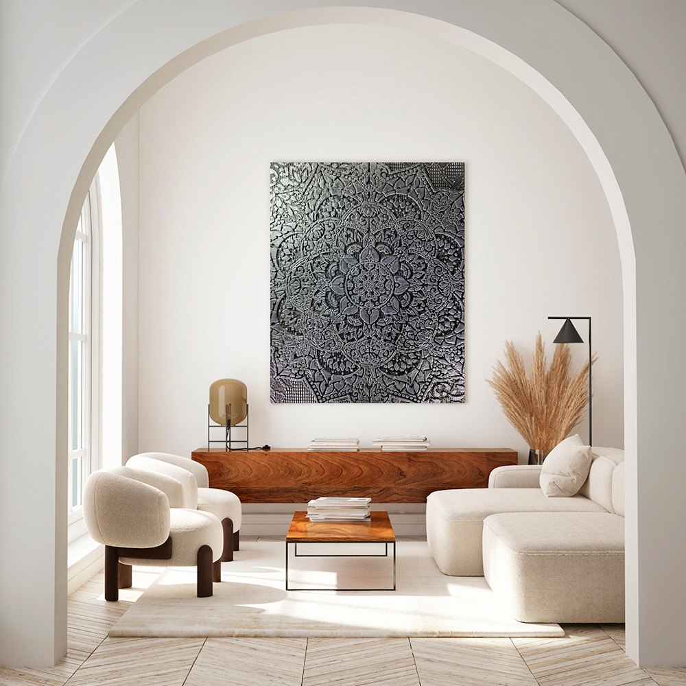 Необычный декоративный эффект, воспроизводящий красоту ручной ковки с её изящными узорами и воздушными орнаментами. Гармонично сочетает в себе прочность металла и лёгкость кружевного плетения. Эффект кованого ажура идеально подходит для акцентных стен в классических, модерн и арт-деко интерьеров, украшая гостиные и каминные зоны.